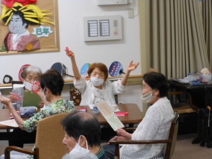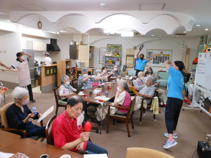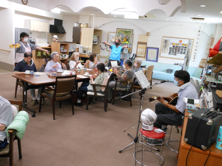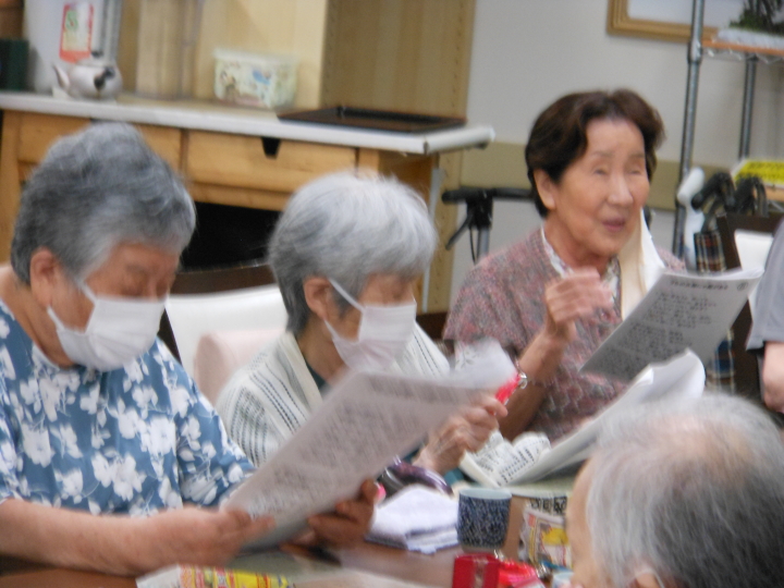 月曜日から土曜日までの一日2回(お昼と夕方)ピアノやギターの演奏に合わせてご利用者様全員で歌詞本見ながら(童謡・唱歌・演歌・歌謡曲etc 550曲程度)の中から毎日大合唱!しています。歌が好きな方・聞くのが好きな方、いろんな方が楽しみにされています。