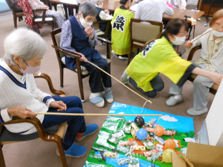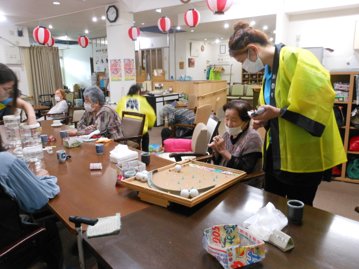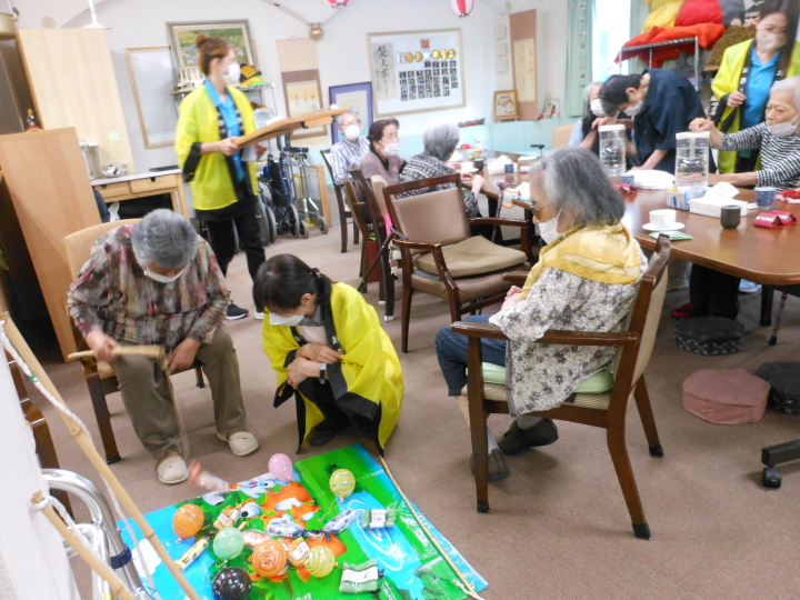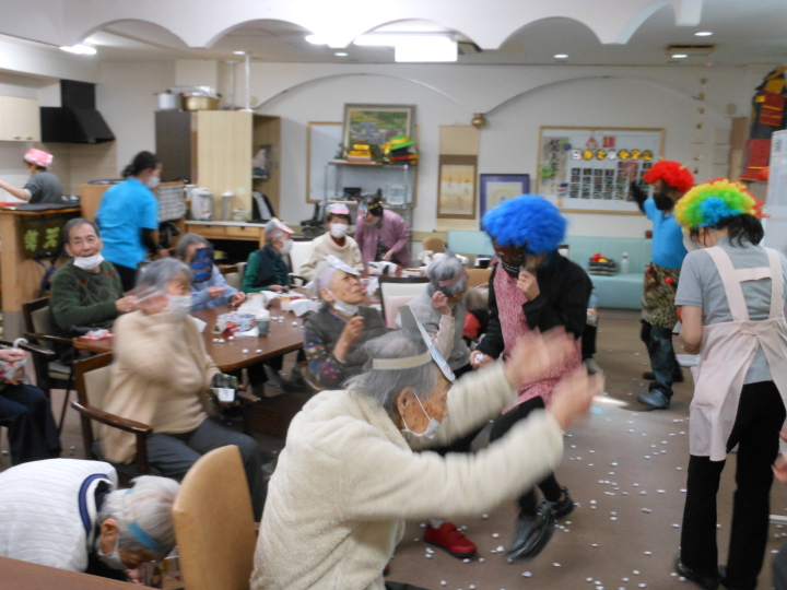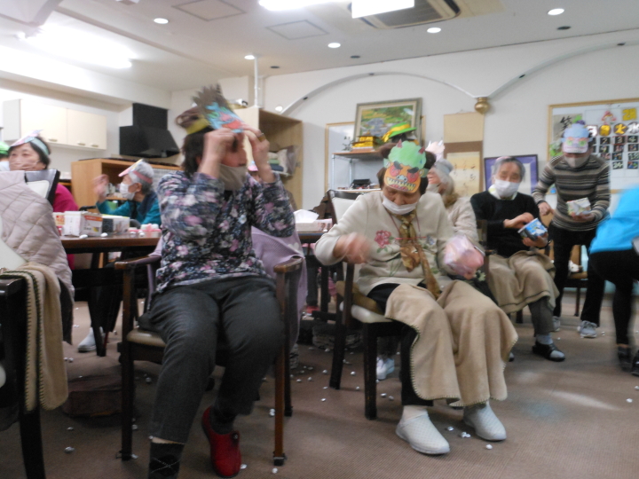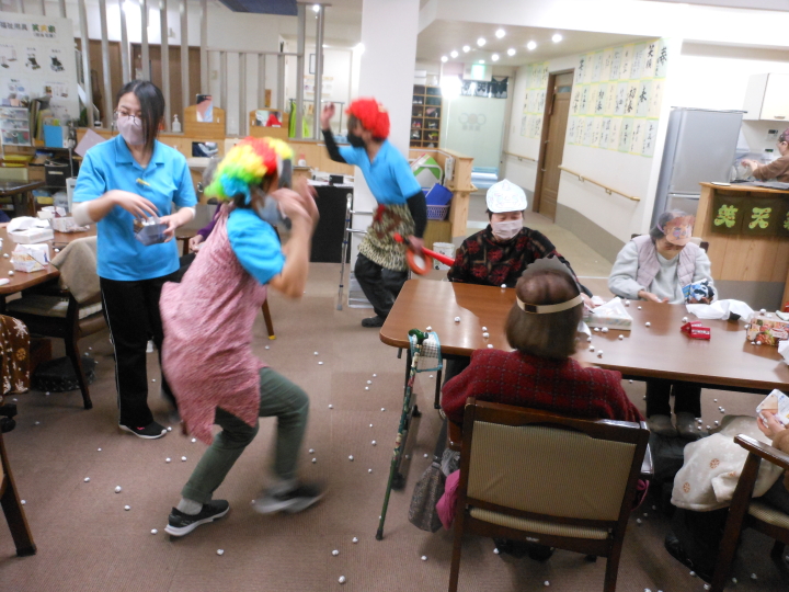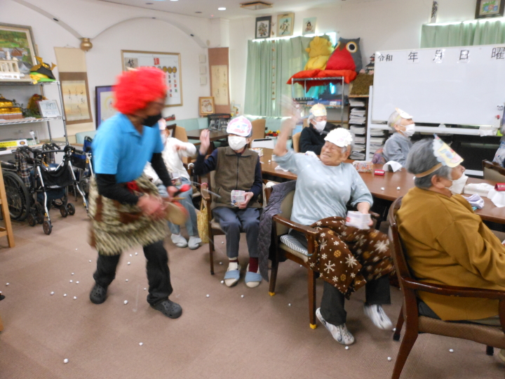 皆さんでお作り頂いた銀紙豆を、職員扮する鬼に向かって(鬼は~外)